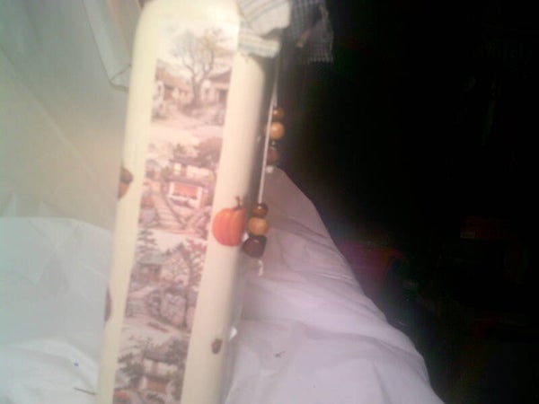 This decorative bottle showcases a unique blend of textures and colors, creating a visually captivating piece. The bottle is painted in a light shade, serving as the perfect backdrop for a vibrant collage wrapped around its midsection. The collage features an artistic mix of landscapes or architectural scenes in shades of green, orange, and blue, adding depth and charm to the design.