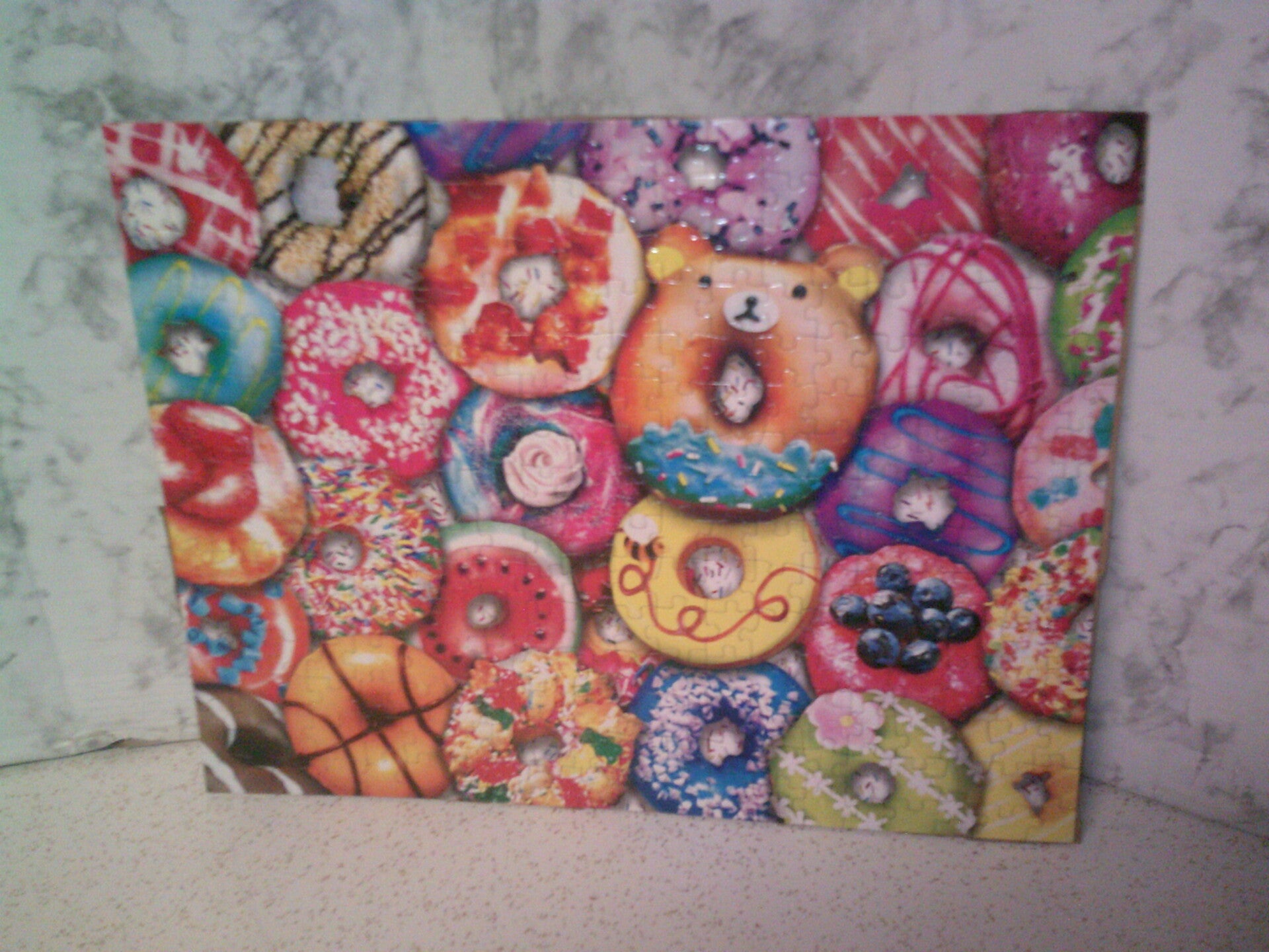 The puzzle is placed on a speckled countertop with a marble-patterned background, enhancing the contrast and making the completed image pop. A sweet and whimsical display, perfect for donut lovers and puzzle enthusiasts alike! 🍩✨
